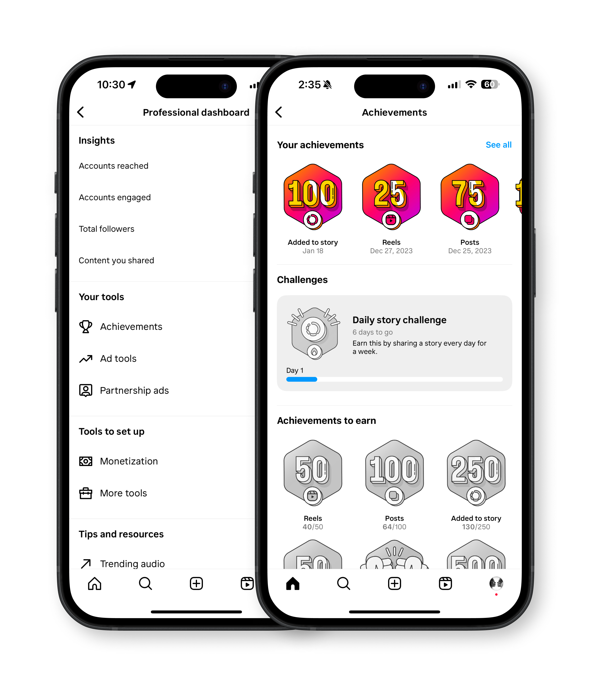 Creators are the core of Instagram's ecosystem and to celebrate, guide, and inspire them, I led the design of a new feature to do that called Achievements.